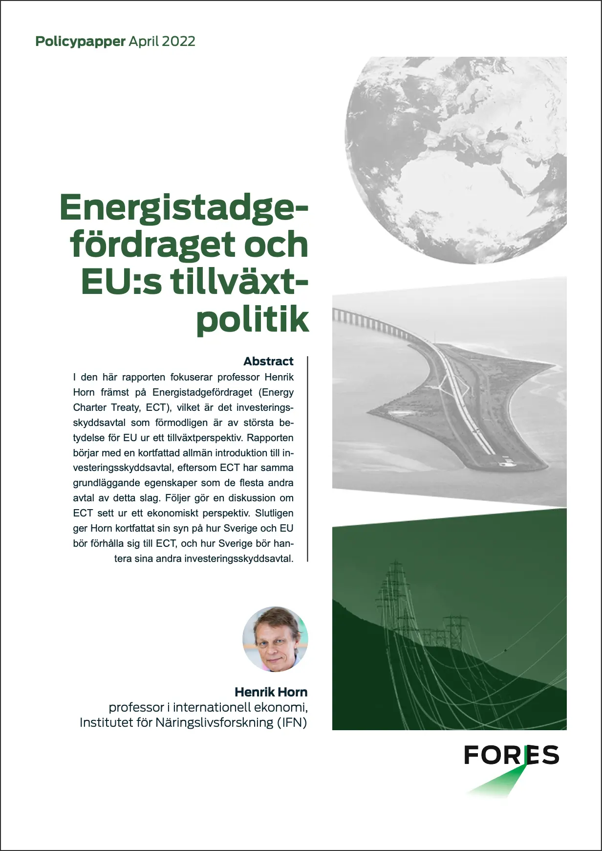 I den här rapporten fokuserar professor Henrik Horn främst på Energistadgefördraget (Energy Charter Treaty, ECT), vilket är det investeringsskyddsavtal som förmodligen är av största betydelse för EU ur ett tillväxtperspektiv.